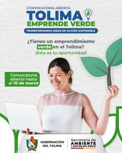 La Gobernación del Tolima, a través de la Secretaría de Ambiente y Gestión del Riesgo, abrió la convocatoria “Tolima Emprende Verde”, un programa que busca fortalecer emprendimientos con impacto ambiental en el departamento.