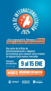 La Gobernación del Tolima informa que desde este 9 hasta el 15 de enero se encuentran abiertas las inscripciones para la tercera convocatoria del programa Ruta de Internacionalización 2026, una estrategia orientada a fortalecer las capacidades exportadoras de las empresas del departamento.