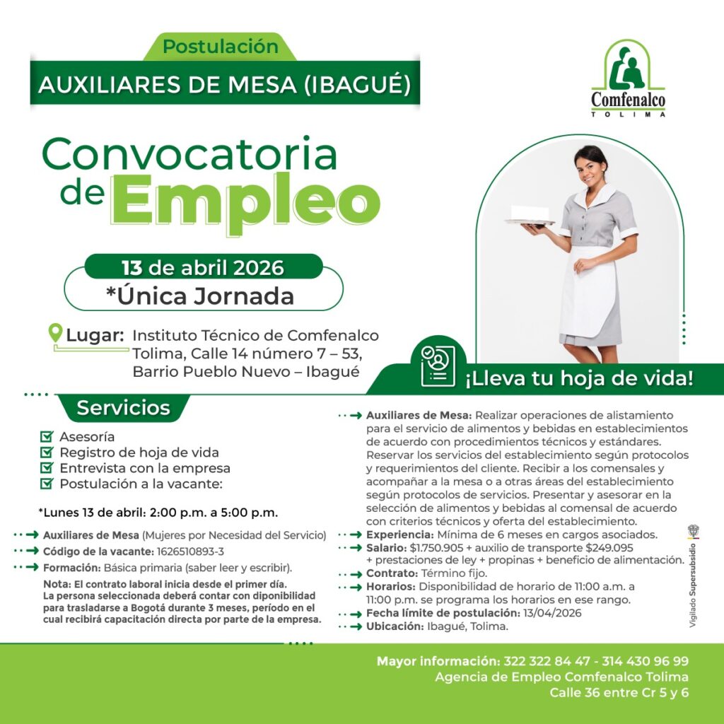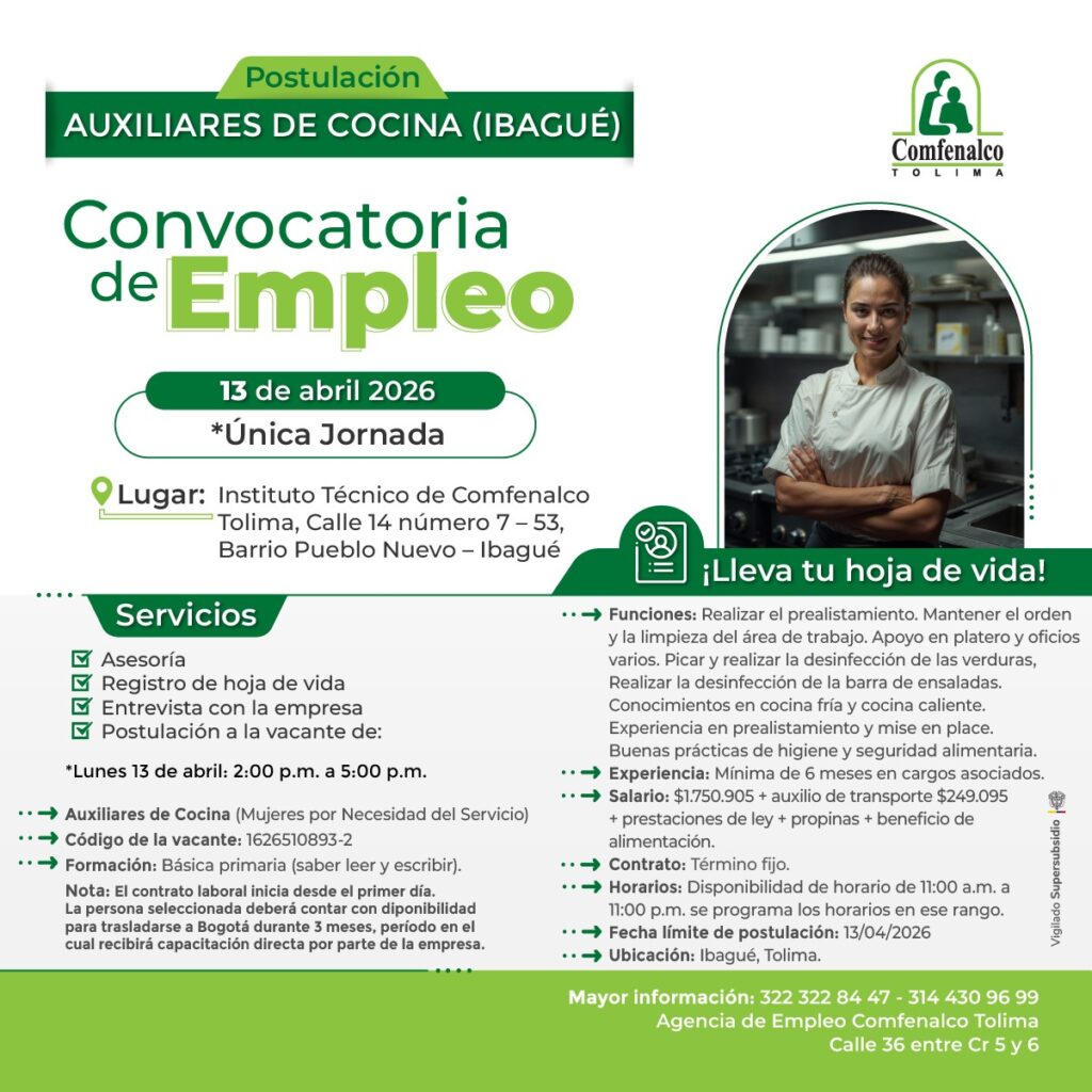 20 abril, 2026La Agencia de Empleo de Comfenalco Tolima ha lanzado una importante convocatoria laboral dirigida a mujeres interesadas en desempeñarse como auxiliares de cocina y de mesa en la ciudad de Ibagué. Esta es una oportunidad de estabilidad laboral y desarrollo profesional en el dinámico sector de la gastronomía y los servicios. Las interesadas podrán participar en un proceso integral que incluye asesoría profesional, registro de su hoja de vida y entrevistas directas con los representantes de la empresa contratante.