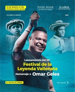 La capital del país, exactamente desde el Teatro Mayor Julio Mario Santo Domingo estará engalanada el sábado 22 de marzo a partir de las 8:00 de la noche, con las notas de los acordeones y cantos con motivo del lanzamiento del 58° Festival de la Leyenda Vallenata en homenaje al Rey Vallenato Omar Geles, excelso acordeonero y extraordinario compositor quien dejó una inmensa huella musical.