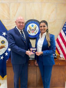 La mandataria fue recibida por John McNamara, encargado de Negocios, y Ann Hardman, consejera política; junto a sus respectivos equipos de trabajo. Durante el diálogo, calificado como profundo y enriquecedor, se abordaron estrategias orientadas al control territorial y a la incorporación de herramientas tecnológicas como un componente importante para fortalecer la seguridad en el departamento.
