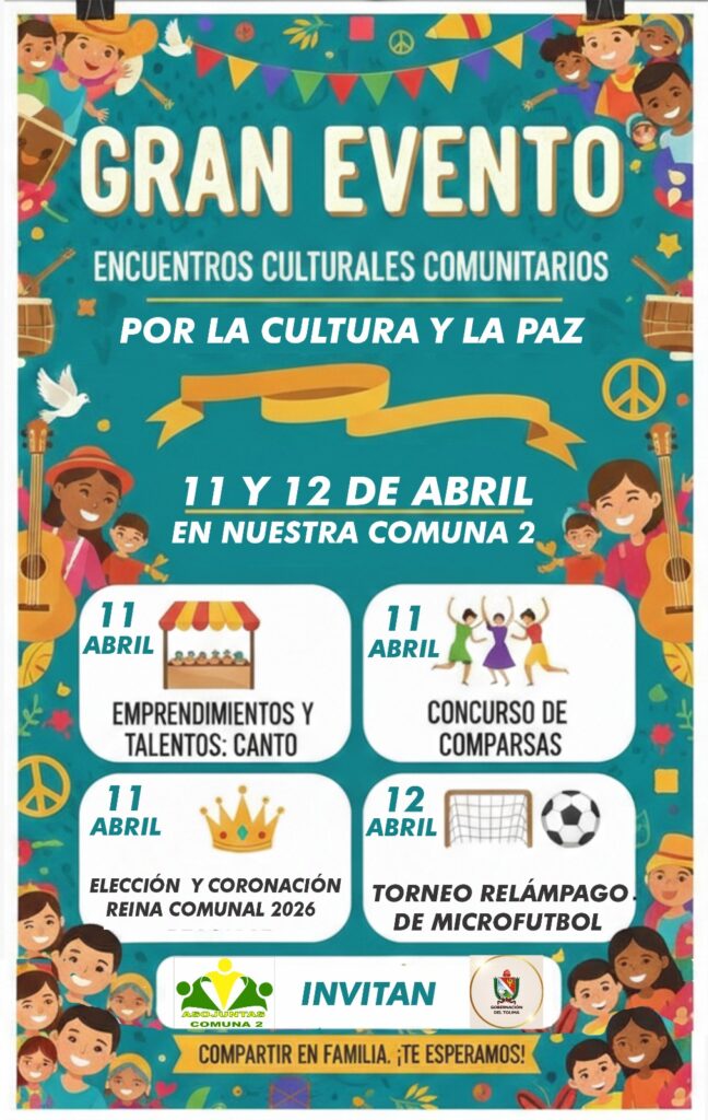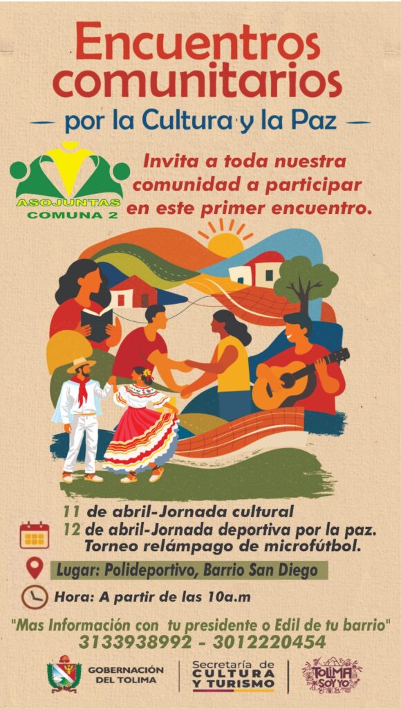 La comuna 2 de Ibagué vivirá una verdadera fiesta de integración con el Primer Encuentro Comunitario por la Cultura y la Paz, una iniciativa liderada por Aso juntas comuna 2 y respaldada por la Gobernación del Tolima, bajo el liderazgo de la gobernadora Adriana Magaly Matiz.