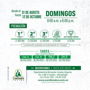 Desde el domingo 31 de agosto hasta el 12 de octubre, todos los domingos entre las 8:00 a. m. y las 6:00 p. m., se vivirá una verdadera fiesta futbolera que reunirá a afiliados y no afiliados de Comfenalco Tolima. El torneo está abierto a equipos conformados por vecinos, amigos, trabajadores, líderes comunales o cualquier grupo con pasión por el deporte.