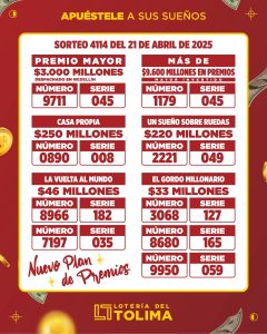 Lotería Del Tolima resultados del sorteo del día de hoy 21 de abril 2025