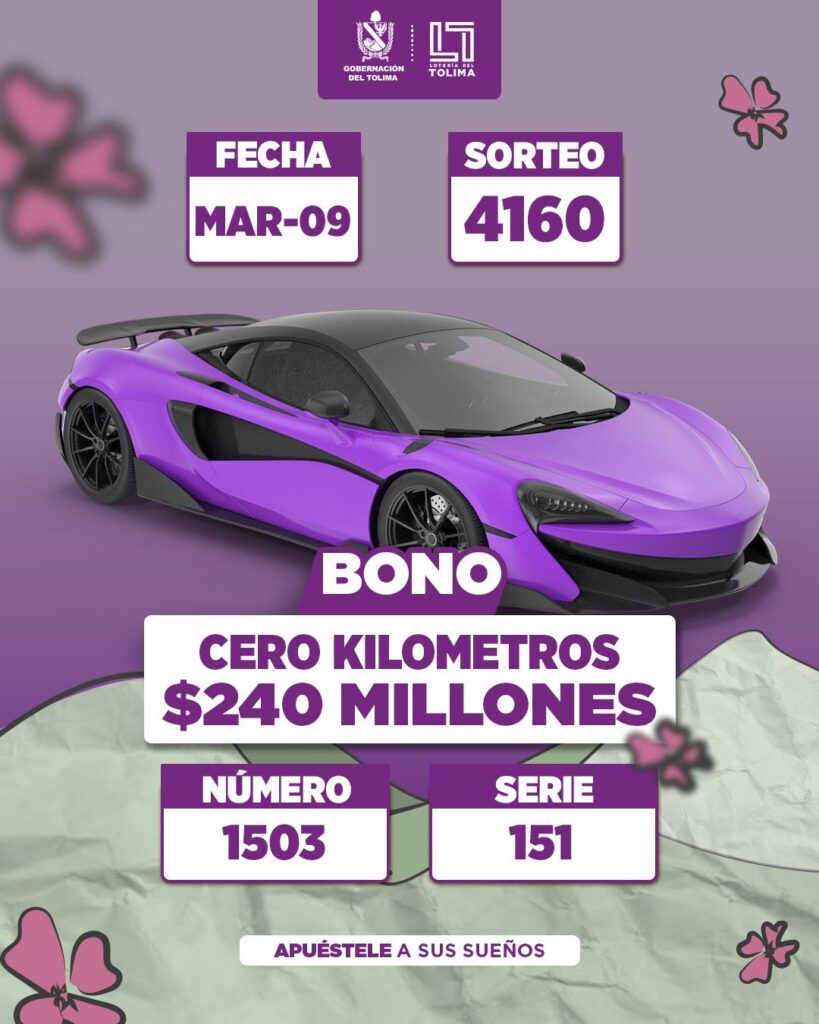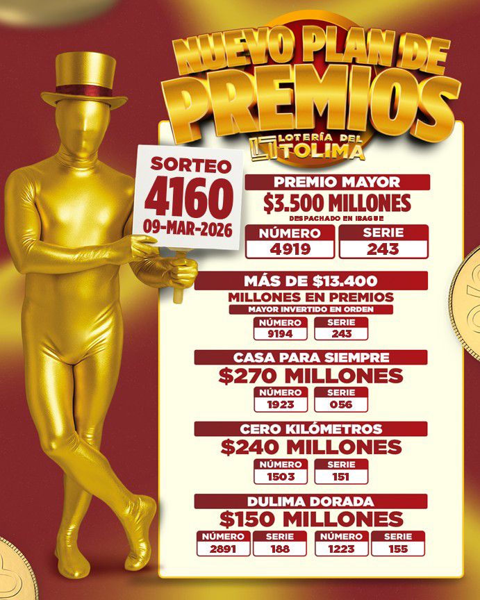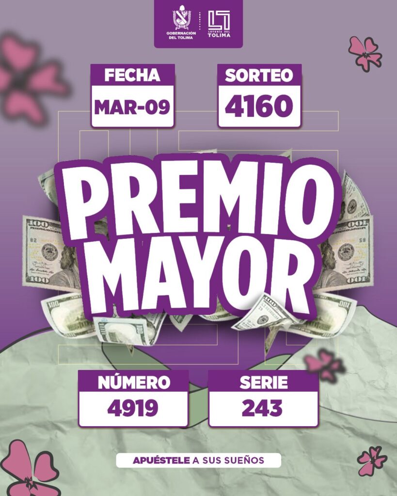 Estos fueron algunos de los resultados del Sorteo 4160 de la Lotería del Tolima realizado el 09 de marzo: