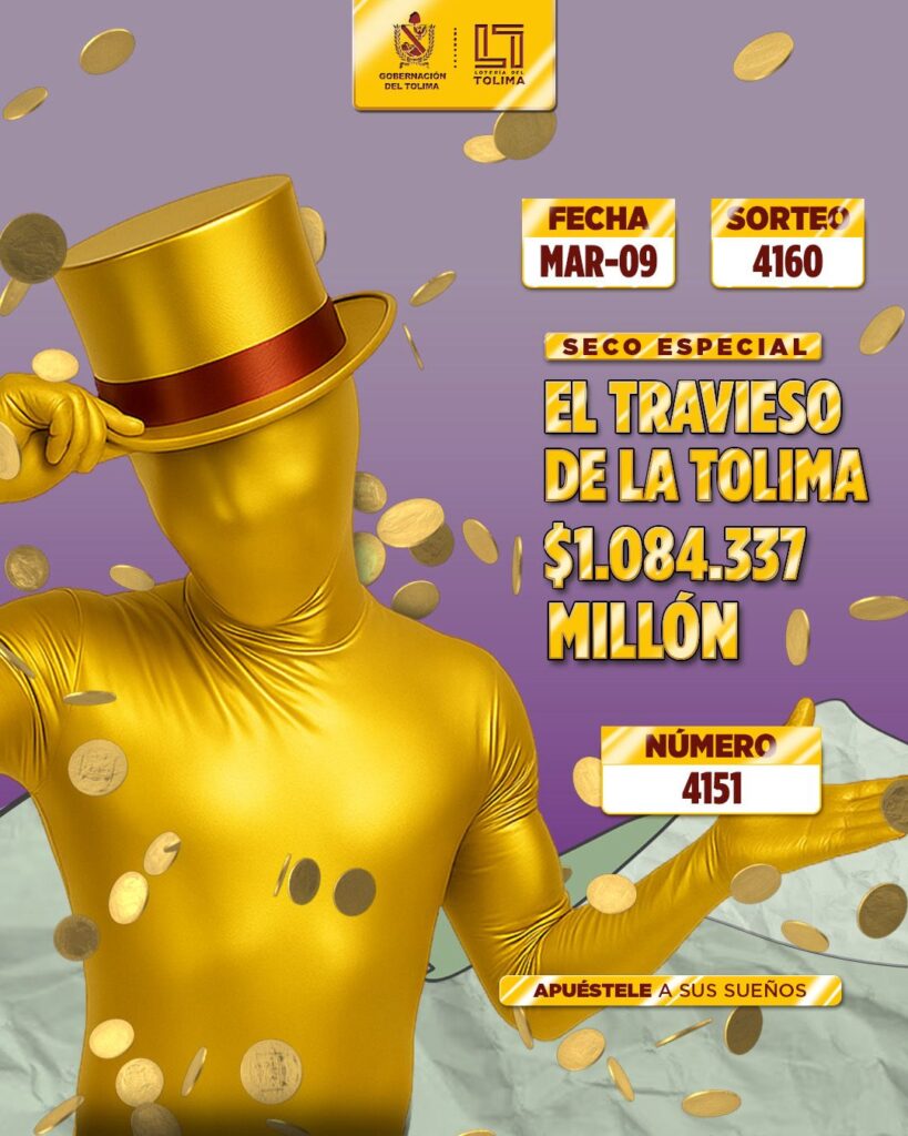 Lotería del Tolima Sorteo 4160 de la Lotería del Tolima realizado el 09 de marzo 2026