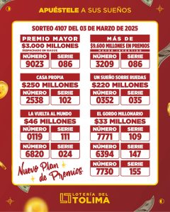 LOTERIA TOLIMA Resultados del sorteo del día de hoy 3 de marzo 2025