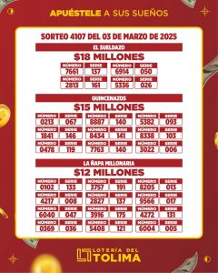 4 marzo, 2025#ResultadosLoteriadelTolima conoce los nuevos millonarios con la Tolima