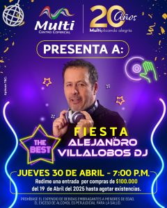 Por otro lado y teniendo en cuenta la fecha oficial de Fundación del Centro Comercial Multicentro, el día 29 de abril compartirán con clientes, colaboradores y comerciantes una jornada especial con música, torta para más de 2.000 personas y un reconocimiento a quienes han sido parte de su historia a partir de las 4 de la tarde, y como broche de oro  en el marco de la celebración de los 20 años de Multi, el día 30 de abril contarán con la presencia y talento del dj Alejandro Villalobos, quien además es el creador de la emisora juvenil La Mega, llegará a las instalaciones del centro comercial con la fiesta oficial del Multi Aniversario 20 años “The Best” con los mejores éxitos de los 80s y 90s dirigida a los mejores clientes de Multicentro durante estos 20 años de historia quienes además han registrado sus compras en el punto de información.