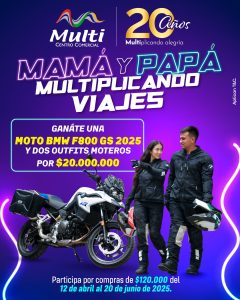 La celebración continua con la campaña “Mamá y Papá Multiplicando viajes”, que iniciará este 12 de abril 2025  hasta el junio 20 de 2025 en la que los participantes podrán ganar una increíble  moto BMW F800 GS 2025 junto con trajes profesionales de motociclismo para hombre y mujer por valor de más de $20.000.000 por compras iguales o superiores a $120.000, permitiéndoles vivir una aventura sobre ruedas totalmente diferente.