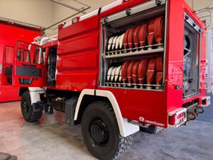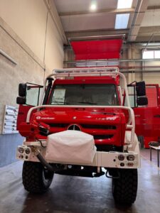 Este vehículo cuenta con la potencia suficiente y de sobra, para acceder a terrenos difíciles y para el accionamiento de la bomba, tanto estacionaria como en movimiento. Asimismo, tiene una protección contra incendios, la cual, mediante rociadores superiores protegerá su estructura, en caso de atravesar un incendio forestal.
