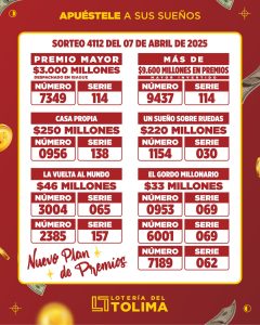Resultados Lotería Del Tolima del sorteo del día de hoy 7 de abril 2025
