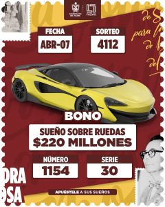 Bono sueño sobre ruedas por $220 millones de pesos con el número 1154 serie 030
