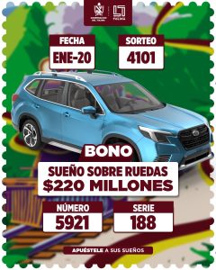 Bono sueño sobre ruedas por $220 millones de pesos con el número 5921 serie 188