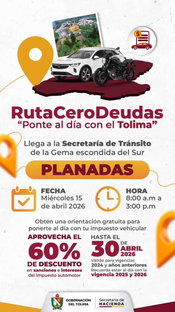 Ibagué, abril 15 de 2026. La directora financiera de Rentas e Ingresos de la Secretaría de Hacienda del Tolima, Cielo Helena Guayara Monroy, recordó a los contribuyentes que el próximo 30 de abril vence el plazo para que se pongan al día con el impuesto vehicular y aprovechen el beneficio del 60% de descuento en intereses y sanciones y reiteró el llamado a los contribuyentes para que no dejen pasar los últimos días de la medida.