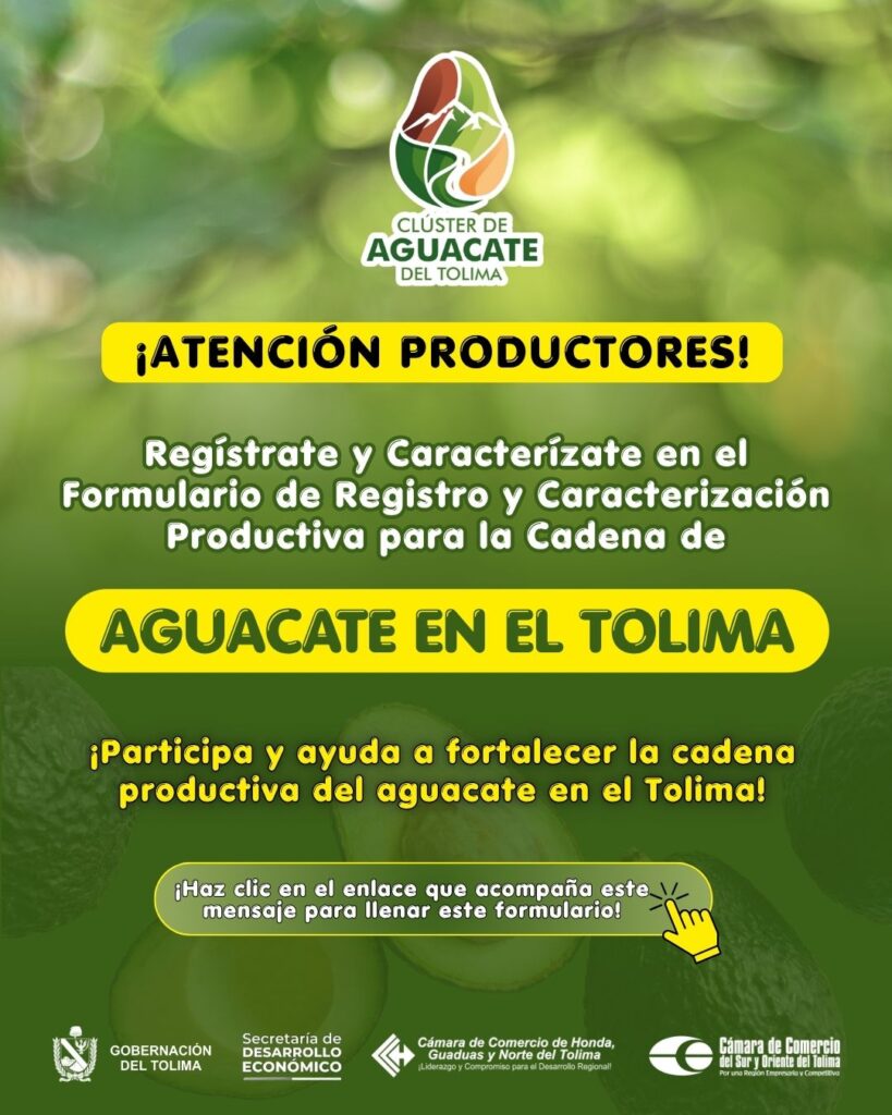 Desde el Clúster de Aguacate del Tolima, en articulación con la Gobernación del Tolima – Secretaría de Desarrollo Económico, la Cámara de Comercio de Honda, Guaduas y Norte del Tolima y la Cámara de Comercio del Sur y Oriente del Tolima, estamos realizando el levantamiento de información productiva del sector aguacatero en el departamento.
