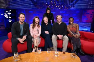 El día 14 de marzo, también a las 7:00 pm, The Graham Norton Show estará presentado por la periodista Claudia Winkleman. En el famoso sofá rojo estará acompañada por los actores Chris Pratt, Toby Jones y Saoirse Monica-Jackson y el cómico Rob Beckett. Acostumbrado a interpretar superhéroes en el Universo Cinematográfico de Marvel, Chris Pratt interpreta a otro personaje basado en los cómics, esta vez en «The Electric State».